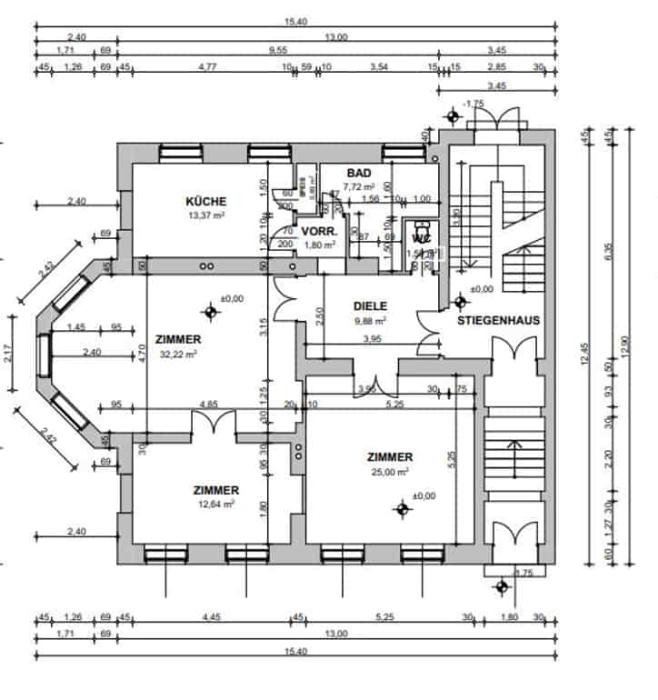 - Großzügiger Vorraum mit Garderobe, großer Wohnsalon, Küche, Bad, WC, 2 Schlafzimmer